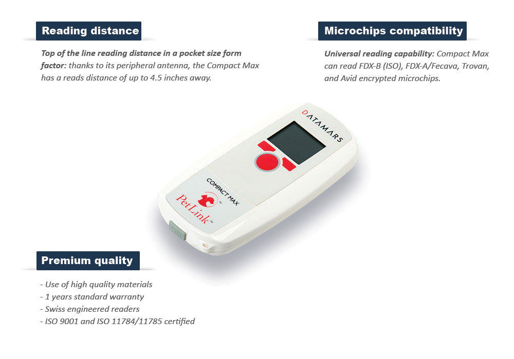 Thanks to its peripheral antenna, the COMPACT MAX features top of the range reading distances in a form factor small enough to fit in your pocket! The scanner is also exceptionally versatile, being able to read FDX-B (ISO), FDX-A/Fecava, Trovan and Avid encrypted microchips. Its water resistant housing also makes it the ideal scanner to use in any condition. COMPACT MAX has great ergonomics and a very intuitive icon based, graphic interface which makes it the easiest reader to use on the market. All of this and it can be charged in your vehicle! Reader only, no micro-chips.
