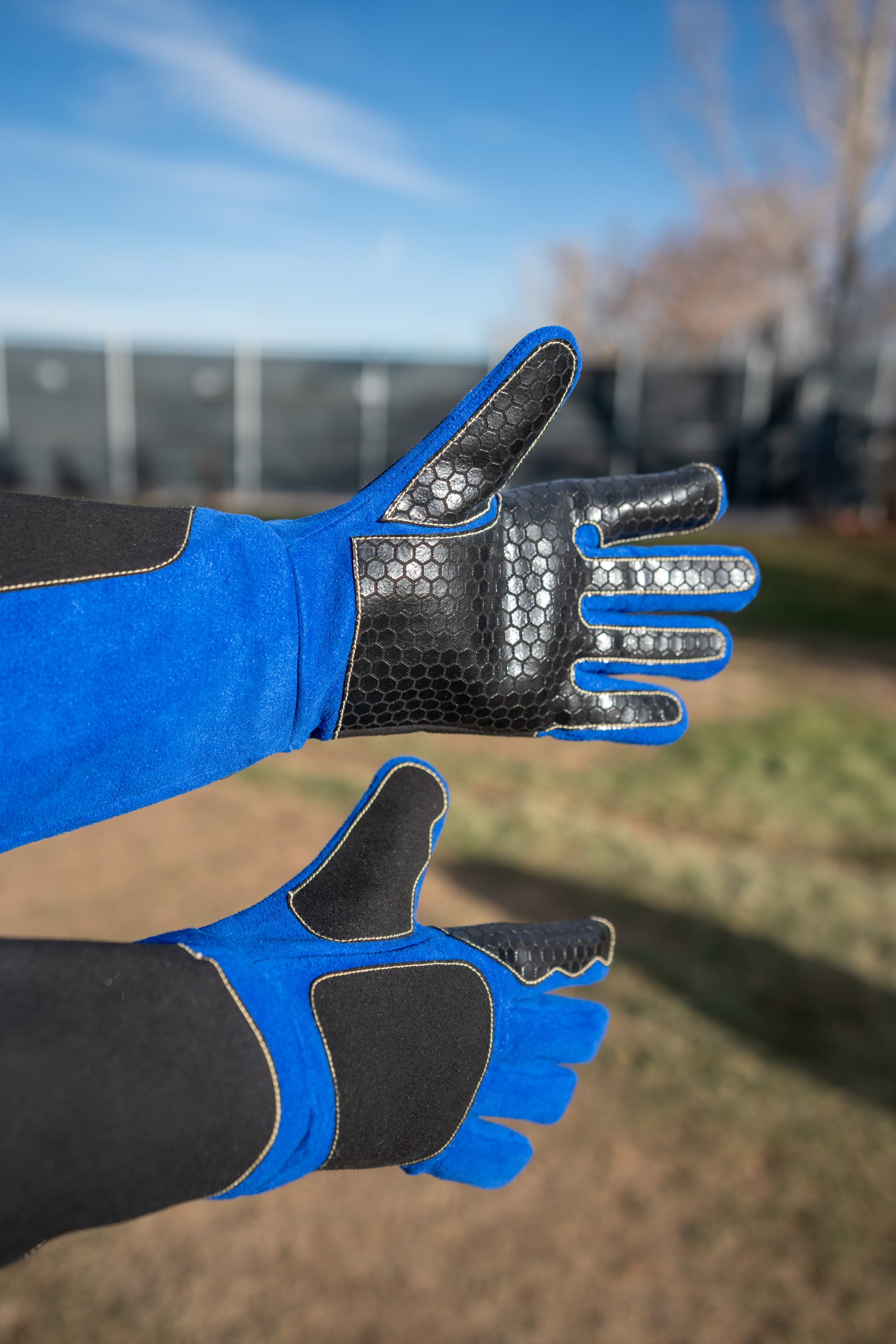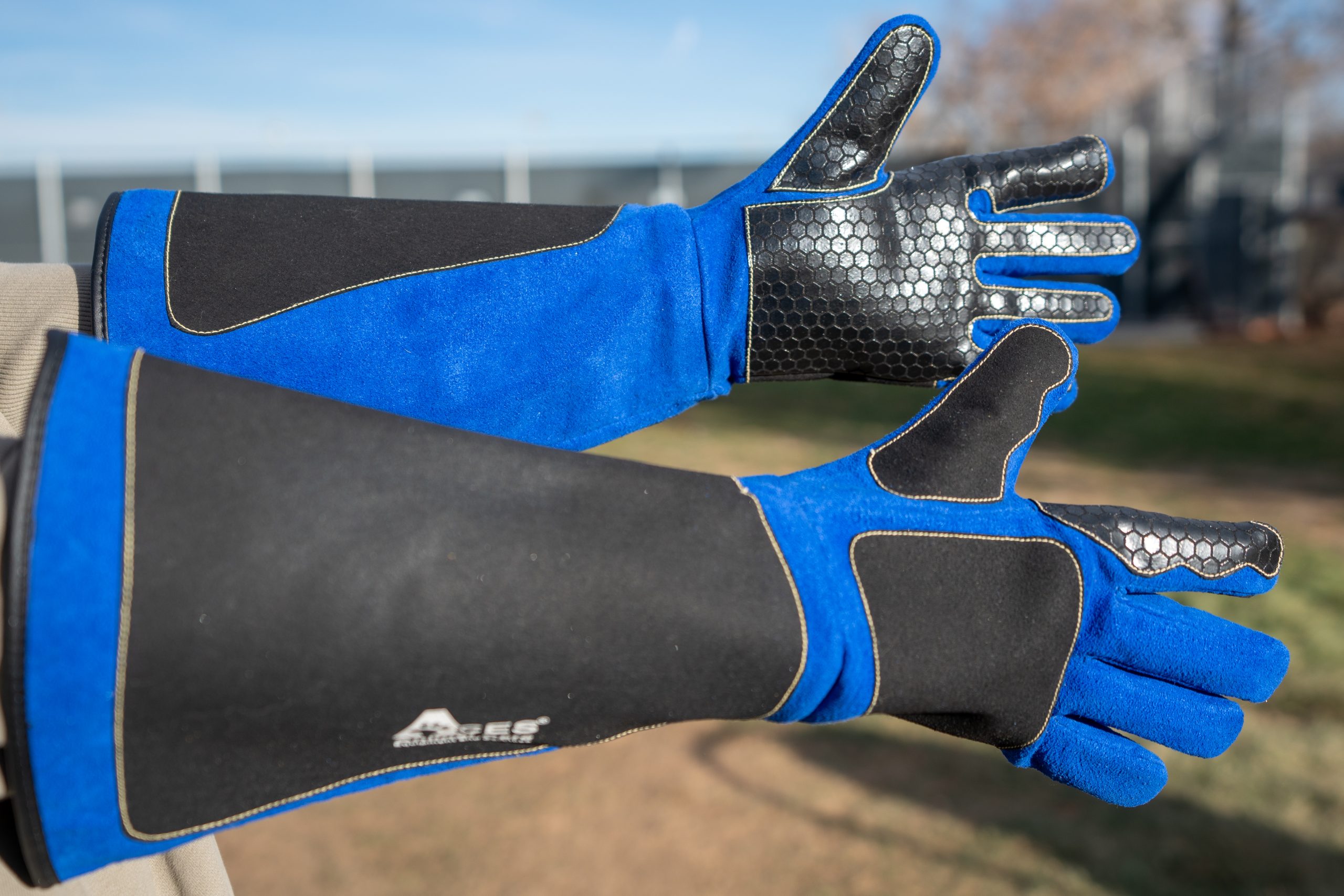 A new addition to our line of Humaniac™ Animal Handling Gloves is our non leather Blue Guardian Safety Glove, manufactured from all synthetic material with a three layer level of protection; outer layer is a synthetic leather, center layer is a level 5 cut resistant fabric and the inner layer is Kevlar®. The Blue Guardian Safety Glove offers hand and arm protection from bites and scratches with a 14″ long gauntlet. We have reinforced the common “bite zones” for added protection and have also added extra gripping to the palm of the glove. These gloves do not have elastic at the top of the gauntlet for comfort.