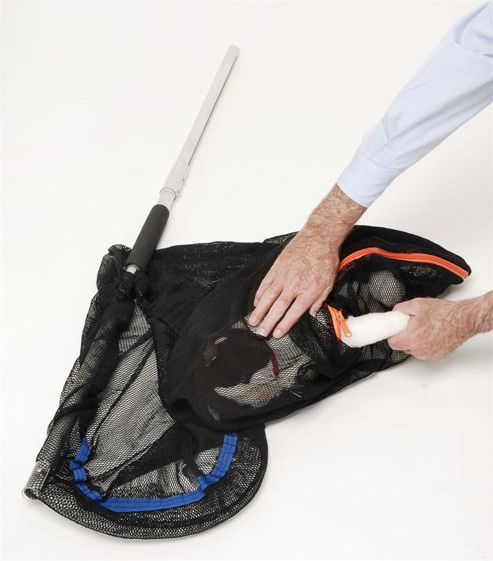 A versatile net capable of reaching into tight spaces. The fine nylon mesh reduces tangling and a full length zipper at the bottom of the net to make for smoother transfers, releases and examinations. For small – medium animals.