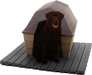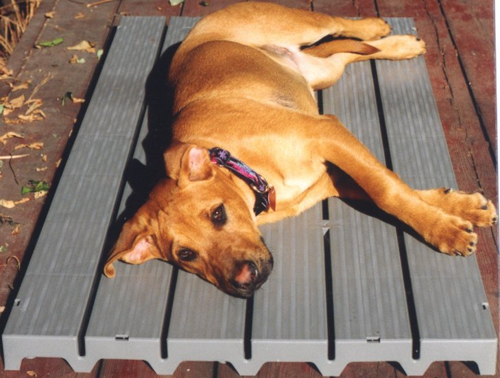 An economical and spacious platform to get dogs off cold concrete. Kennel Deck® is molded from a very tough plastic and is easy to clean and disinfect. Not harmed by urine, feces, or chemicals. It lies flat on the floor and the dogs love it!