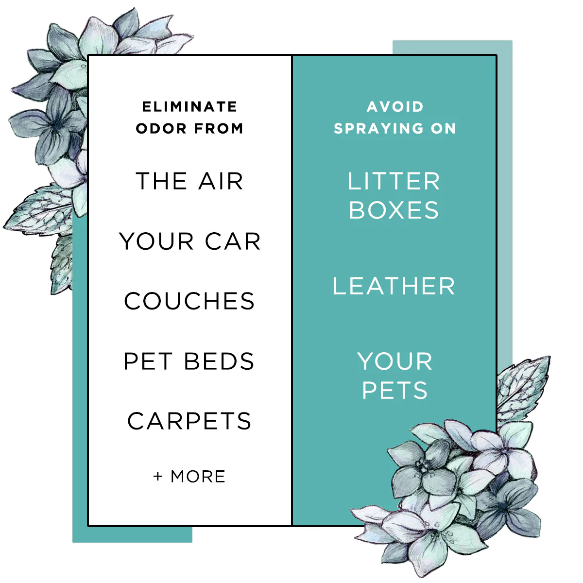 Spray on: air, your car after a ride, couch, dog house, pet beds, pet carriers, puppy pee pads pre-trash, rugs, and other household surfaces our furry friends leave their funky fumes.